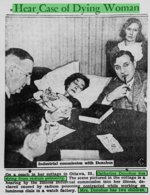 “Catherine Donohue lies dying from radium poisoning... Mrs. Donohue has two children” ("Hear Case of Dying Woman." )