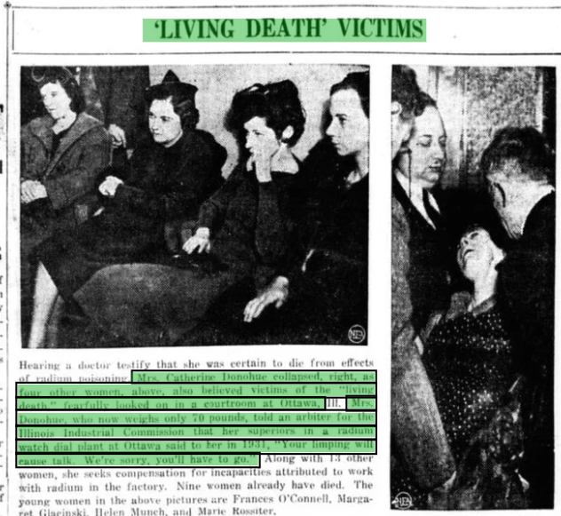 “Mrs. Donohue, who now weighs only 70 pounds, told an arbitrer... her superiors in a radium watch dial plant at Ottawa said to her in 1931,