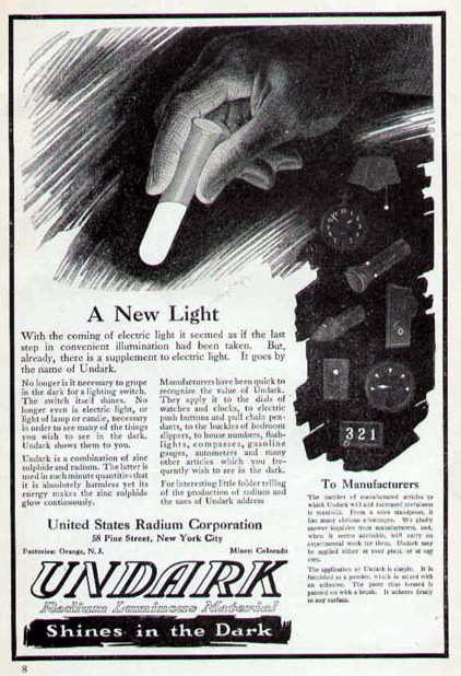 “Inventor William J. Hammer went to Paris... Hammer discovered that by mixing the radium with glue and zinc sulfide, he could make glow-in-the-dark paint. His discovery would soon be used by the U.S. Radium Corporation to manufacture wristwatches with radium-painted dials.”